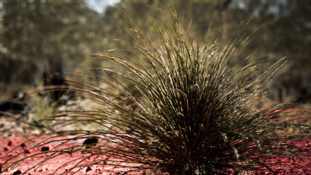 in the australian outback some dry bushes and grasses stand in the desert