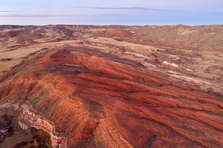 dusk over foothills of Rocky Mountains in northern Colorado with red sandstone and canyons, aerial view