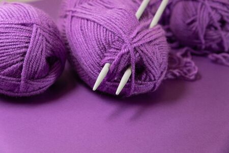 Soft yarn, delicate purple yarn. Hand knitting as a hobby.. High quality photo