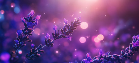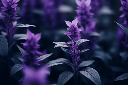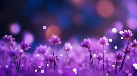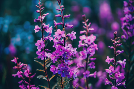 Vibrant purple flowers bloom, creating a serene and mystical atmosphere against a cool blue backdrop