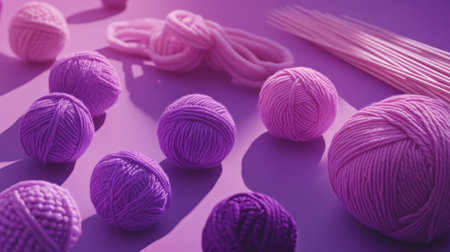 An inspiring scene featuring an assortment of purple and pink yarn balls alongside knitting supplies. Ideal for showcasing creativity and craft projects.
