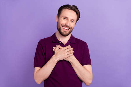 Photo of young cheerful man hands on chest grateful soul cardiology isolated over violet color background