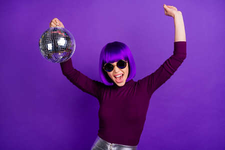 Portrait of cheerful girl with eyeglasses eyewear raising her arms screaming holding glowing ball wearing turtleneck isolated over purple violet background