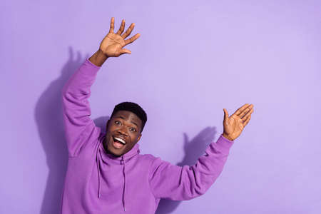 Portrait of attractive cheerful carefree guy dancing rest fooling isolated over bright violet lilac color background