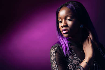 Black girl portrait. Afro woman with purple hair and lips. American african fashion model. Exotic black model.