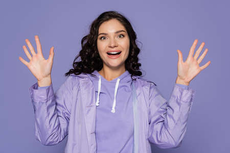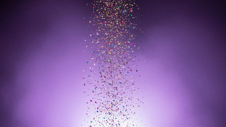 Excited unique woman clapping hands, having fun, screaming WOW, rejoices over confetti rain in studio. Extraordinary girl with violet dyed hairstyle. Concept of celebrating, party, winning