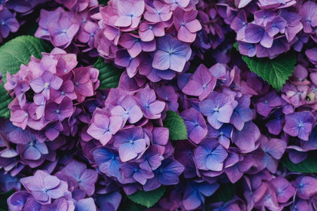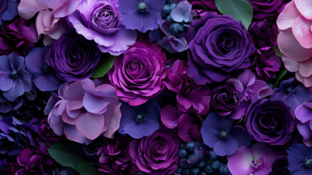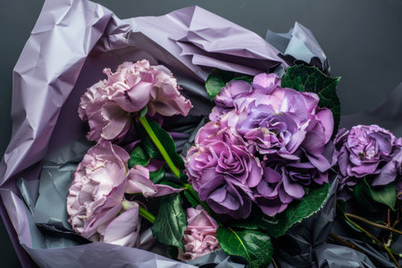 A bouquet of purple flowers with a mix of roses and hydrangeas. The flowers are arranged in a way that creates a sense of depth and texture. Scene is one of beauty and elegance