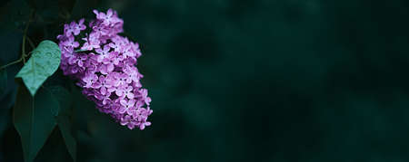 beautiful branch of lilac flowers on a dark green blurred background. long natural banner. concept for spring greetings. space for text
