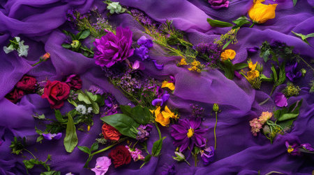 This vibrant floral arrangement features a variety of colorful flowers artfully scattered on a rich purple tulle background, showcasing elegance and creativity in design.