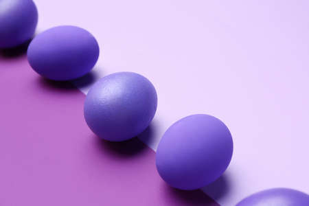 Purple chicken eggs on a yellow background and a branch of mimosa with shadows. easter spring background. copyspace. Very peri tinting
