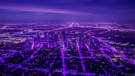 An aerial view of a sprawling city at night, bathed in an intense, vibrant purple glow. The neon lights from streets, buildings, and possibly bridges create a almost futuristic urban landscape. The dark sky contrasts sharply with the bright, electric illumination below. captures the energetic and dynamic essence of a modern metropolis after dark, with a strong emphasis on the artificial light that defines its character.