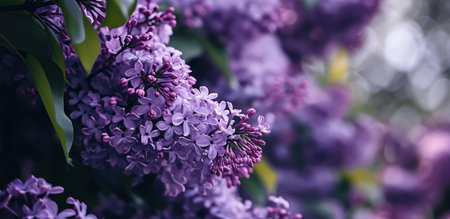 Blossoming lilac flowers close-up, blurred spring background.