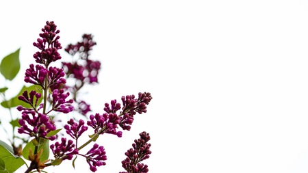 Spring flower. Beautiful branches of lilac on a white background. Copy space, flat, lay. Banner.