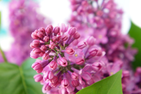 Blossoming lilac flowers close-up, blurred spring background.