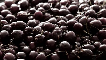 A lot of fresh sweet cherry fruit berries with water drops, close up. Pile of ripe cherries. Large collection of fresh red cherries. Ripe cherries texture background.