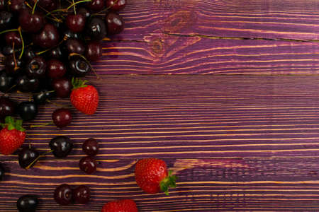 Fresh Summer Strawberries and Cherries on Old Vintage Wooden Background with Copyspace. Burgundy Wood Table Desk Board Texture with Ripe Forest Berries Top View