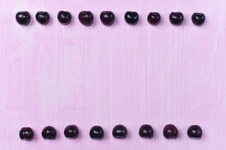 Smart heat framed copy space bordered with fresh cherry fruit in burgundy color. Flat lay pastel pink color background.