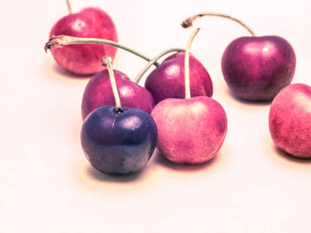 Seven surreal cherries isolated on light background.