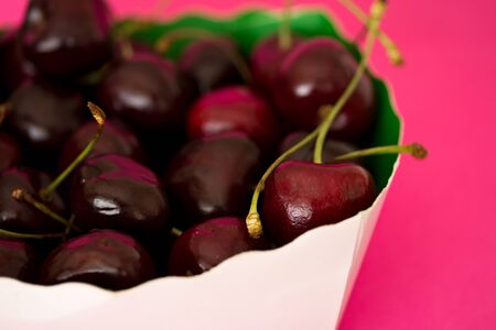 Close up of red raw fresh sweet cherries on pink background. Macro view emphasizing texture, juiciness, and freshness for food designs, health eating, wallpaper, backdrop