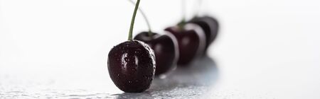 panoramic shot of fresh, sweet, red and ripe cherries with droplets on white background