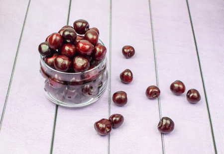 Sweet cherries in glassware. Concept of healthy and proper nutrition, diet, low calories. Top and side view. Selective focus.