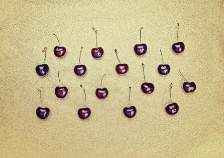 Large group of juicy and ripe cherries on the glitter golden background Pattern Greeting card concept