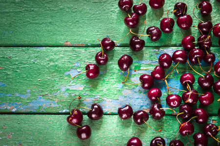 Scattered black cherries on a grungy background. flat lay.