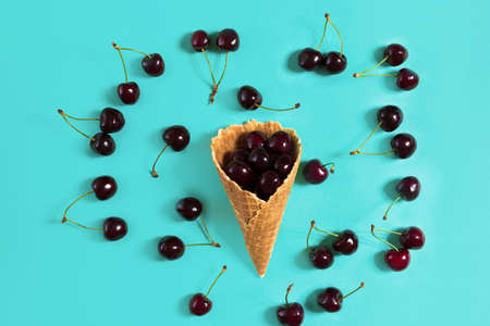 Cherries in a waffle horn on a blue background
