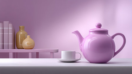 A charming pastel scene showcasing a pink teapot and white cup, perfectly arranged on a minimalist table, creating a tranquil and inviting atmosphere for tea lovers.