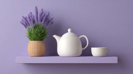 This serene scene features a lavender plant in a woven pot, a white teapot, and a cup on a purple shelf, captivating elegance in modern home decor.