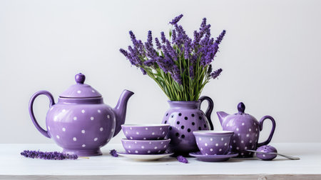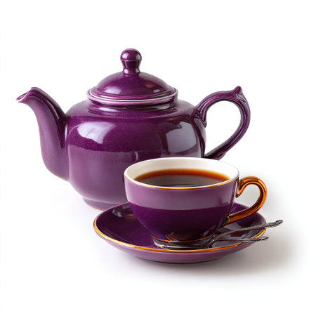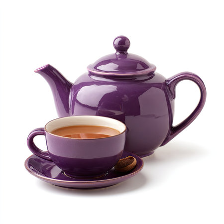 A purple teapot and teacup are displayed on a white background. The teacup sits on a saucer, and the composition features a high-key lighting style. These elements combine to suggest a tranquil and inviting atmosphere, suitable for various design projects and commercial applications.