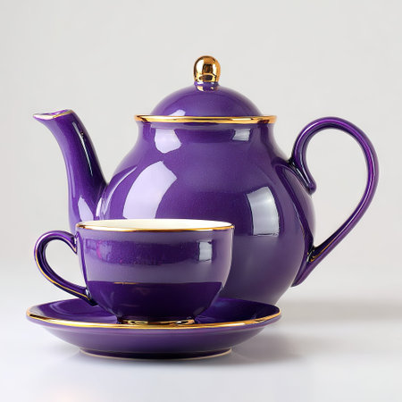 A refined still life presents a vibrant purple teapot, teacup, and saucer ensemble. The glossy surfaces reflect soft lighting, and gold accents enhance the design. The composition is clean, possibly in a studio setting, suitable for visual media and commercial applications.