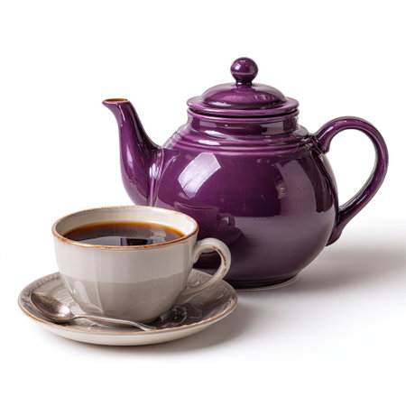 A ceramic teapot and cup of coffee sit on a white surface, creating a visual contrast. The rich purple of the teapot complements the coffee in the cup and the neutral tones of the saucer. The composition suggests a relaxed setting and might be suitable for use in promotional materials or editorial content.
