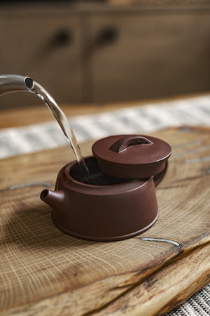 An Elegant Teapot Gently Pouring Hot Water in a Stylish Modern Kitchen Environment