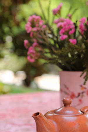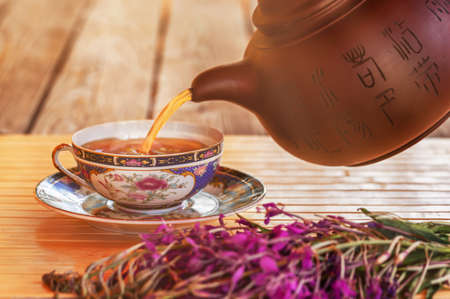 Tea ceremony outdoors. Tea is poured from a clay teapot into a porcelain cup. Nearby on a wooden table lies a fresh branch of tea with purple flowers
