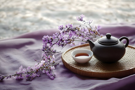 Delicate tea set rests on a woven tray, surrounded by lavender blossoms and gentle ocean breezes.