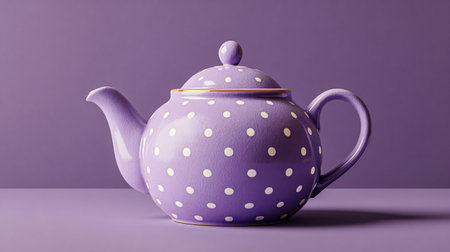 Polka dot purple ceramic teapot sits against a solid lilac background