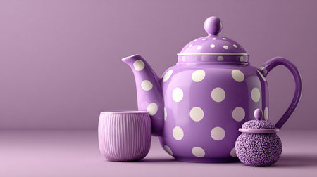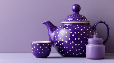 Vibrant purple polka dot teapot and cup set against a lilac background