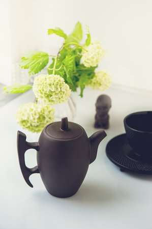 Traditional tea ceremony accessories, teapot and teacup with wooden background