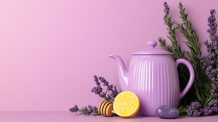 Lavender tea pot with lemon and lavender flowers. 3d rendering