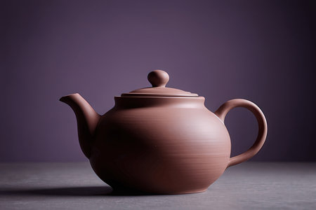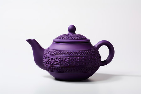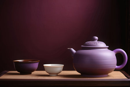 An exquisite composition displays a purple teapot and teacup. The objects feature smooth textures and a glossy finish. The image is brightly lit, showcasing the rich color. Suitable for illustrating themes of leisure, beverage consumption, or related commercial applications.