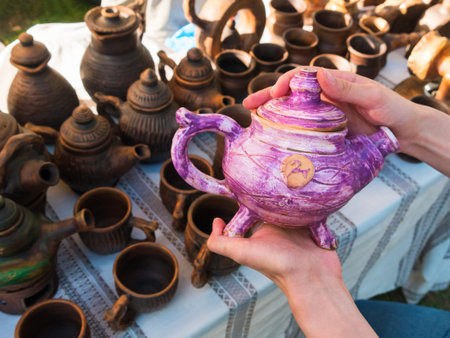 Close up of woman hands with purple handmade ceramic kettle at art souvenir market. Handicraft, creative and artwork concept