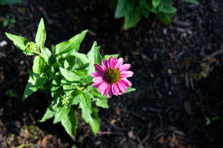 one echinacea flower against the background of earth and green leaves
