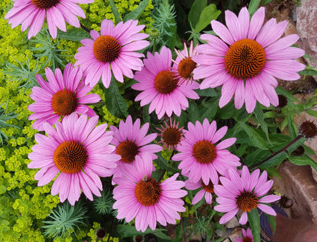 Pink echinacea flowers blooming on a backdrop of green leaves. Echinacea purpurea for poster, branding, calendar, multicolor card, banner, cover, post, header for website. High quality photo