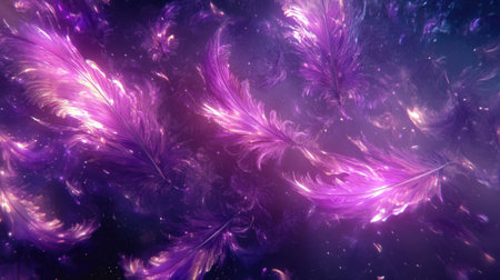 An enchanting display of pink and purple feathers floats in a cosmic space, surrounded by sparkling stars. The colorful background evokes a dreamy and whimsical atmosphere, perfect for artistic designs.