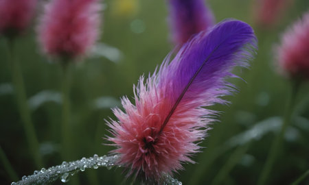 Generative AI : Beautiful large dew drops or rain on the poultry feather closeup Beautiful light and blurred soft background in red and purple color Water Drops on fluffy feather m
