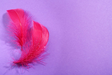 Fluffy pink feathers with water drops on purple background, closeup. Space for text