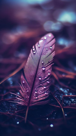 A delicate feather rests adorned with glistening droplets, set against a soft background of deep indigo and vibrant violet hues that evoke a serene twilight atmosphere.