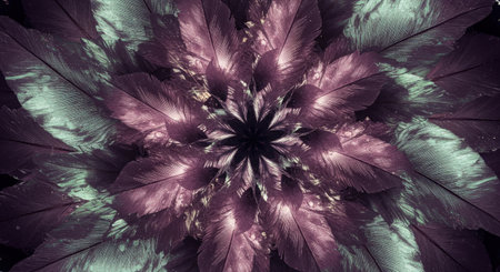 Abstract feather kaleidoscope: vibrant purple and green feathers arranged in intricate radial patterns. Creates a mesmerizing, ethereal natural design.