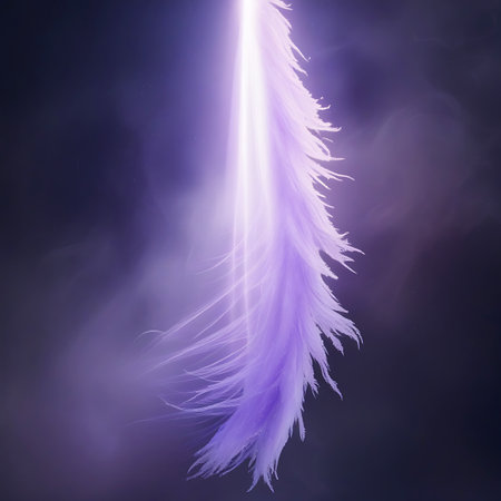 A luminous purple feather with wispy strands is illuminated by a bright, vertical light beam. Clear details and vibrant colors enhance visual appeal.